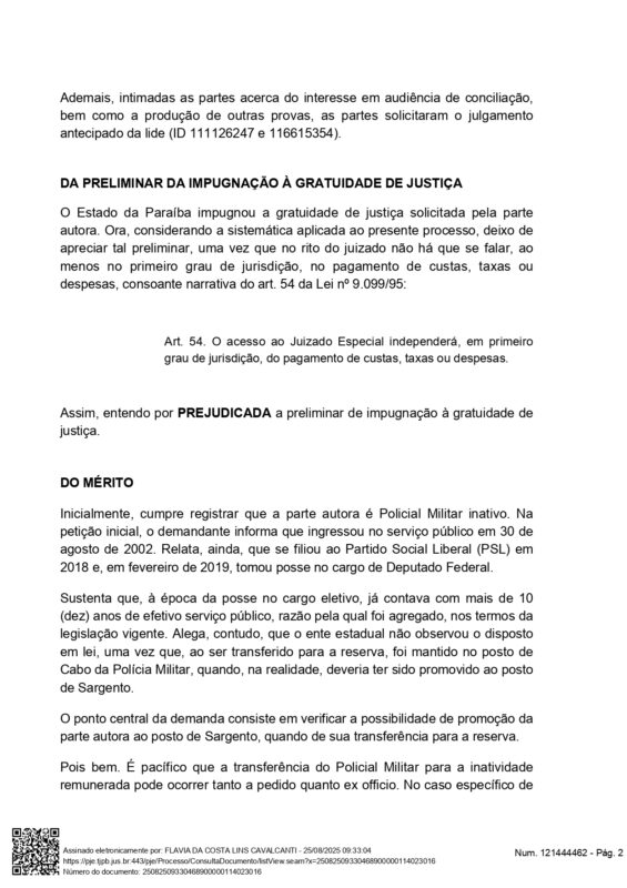 “Considerando que o autor foi transferido para a reserva remunerada (ID 82418306) e que, à época, ocupava o posto de Cabo, não há justificativa legal para o indeferimento de sua promoção ao posto imediatamente superior, nos termos da legislação aplicável. Ressalte-se que esta constituirá, inclusive, em sua última promoção na carreira militar“, disse a juíza na decisão, como obtido pelo ClickPB.