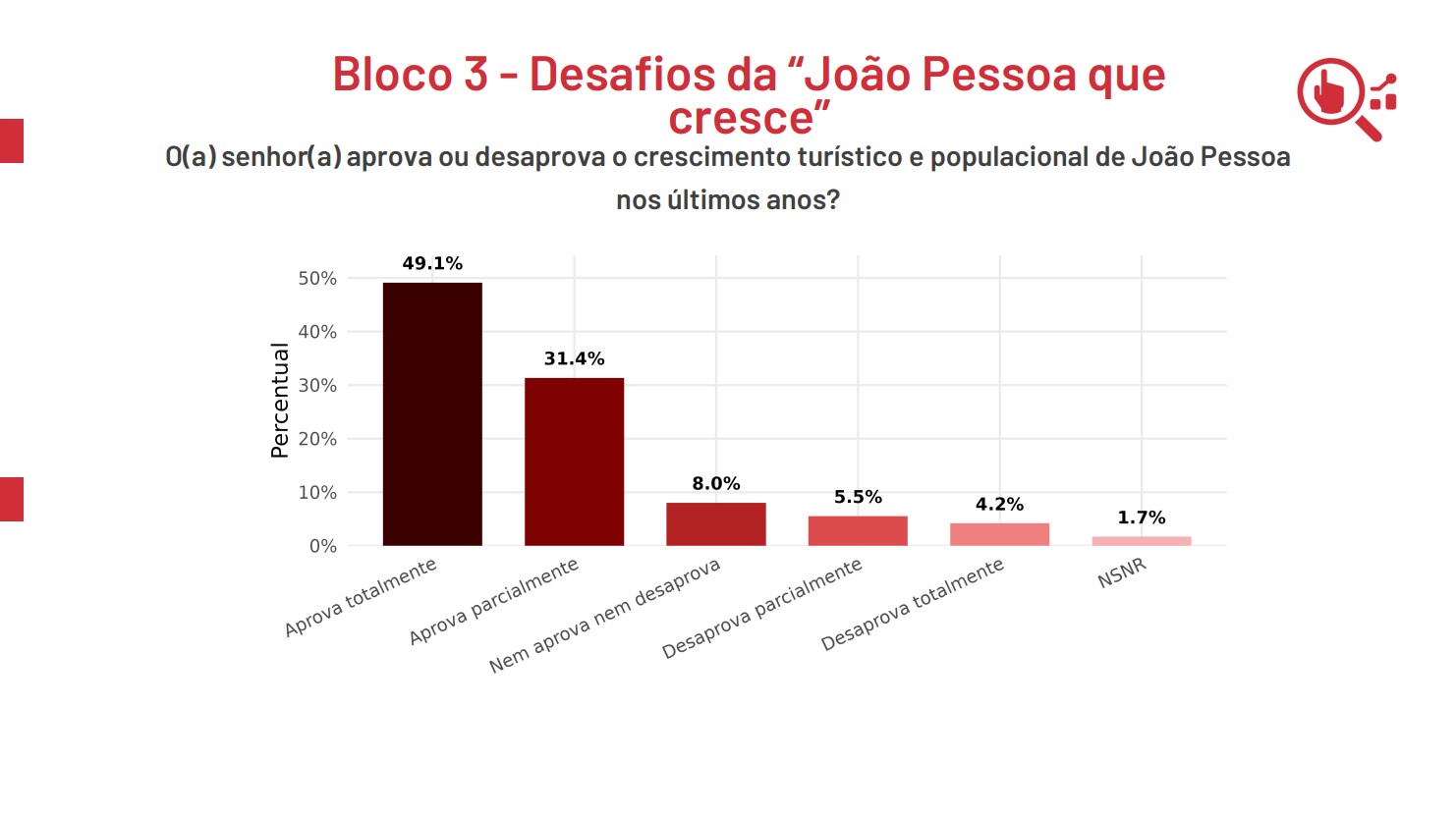 De acordo com a consulta, que ouviu 400 moradores da cidade, cerca de 44,2% APROVAM TOTALMENTE, e outros 34,5% APROVAM PARCIALMENTE o desenvolvimento turístico que João Pessoa tem tido. Segundo o levantamento, realizado entre os dias 5 e 22 de novembro de 2025, apenas 5,0% DESAPROVAM TOTALMENTE o crescimento do turismo em João Pessoa.