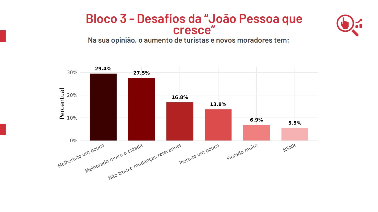 Para 54,3% dos entrevistados que moram em João Pessoa, este crescimento tem melhorado a cidade em vários aspectos. Para 32,5%, inclusive, tem MELHORADO UM POUCO e 21,8% informaram que tem MELHORADO MUITO. De acordo com a pesquisa, 23,3% dos moradores entrevistados afirmaram que o avanço da atividade turística contribuiu para piorar a cidade, sendo 15,1% considerando que PIOROU UM POUCO e 8,2% que PIOROU MUITO.