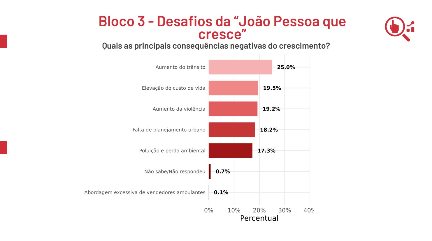 Para maioria dos entrevistados, a intensificação do trânsito é o impacto mais negativo gerado pelo aumento de circulação de turistas na cidade. Aumento do trânsito foi o item mais citados nas perguntas de respostas múltiplas. Os resultados da pesquisa mostram que 24,5% dos moradores consultados apontaram o aumento do trânsito como maior problema numa João Pessoa que amplia sua visitação turística a cada ano.