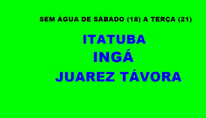 O abastecimento de água das cidades de Itatuba, Ingá e Juarez Távora, no Agreste paraibano, vai ser suspenso a partir deste sábado (18) até a manhã da terça-feira (21), segundo informou a Companhia de Água e Esgotos da Paraíba (Cagepa). A interrupção no abastecimento, segundo o órgão, se deve a uma manutenção preventiva no sistema integrado Acauã-Itatuba.