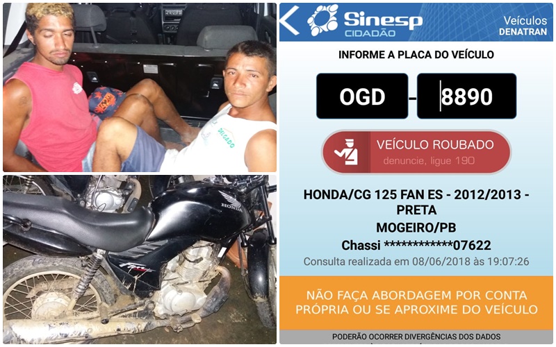 Após abordar dois indivíduos que estavam em um moto, as GUs realizaram a consulta tanto do veículo quanto dos ocupantes. Assim foi identificado que a moto possuía queixa de roubo/furto. A mesma havia sido furtada na noite de ontem (07/06/18) na cidade de Mogeiro. Os indivíduos são reincidentes no cometimento deste tipo de ilícito. Ambos foram conduzidos para a DP de Itabaiana para a lavratura do flagrante.
