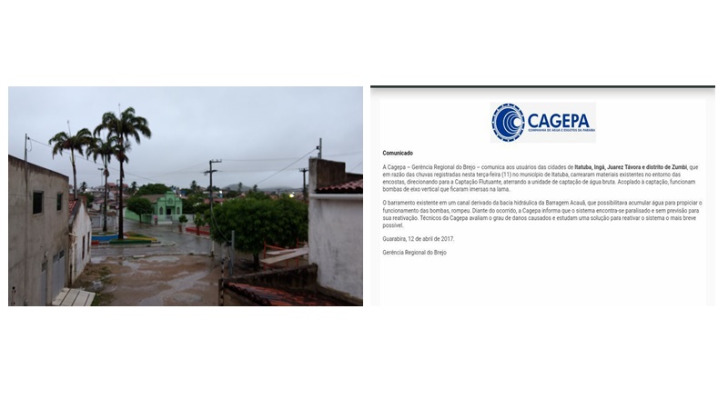 As últimas chuvas estão sendo comemoradas por agricultores, pecuaristas e populações urbanas, porém trouxe problemas também. A Cagepa divulgou nota informando sobre a chegada de materiais das barreiras trazidos pela chuvas que apresentaram complicações na captação e anunciou a suspensão do fornecimento atá a resolução do problema.