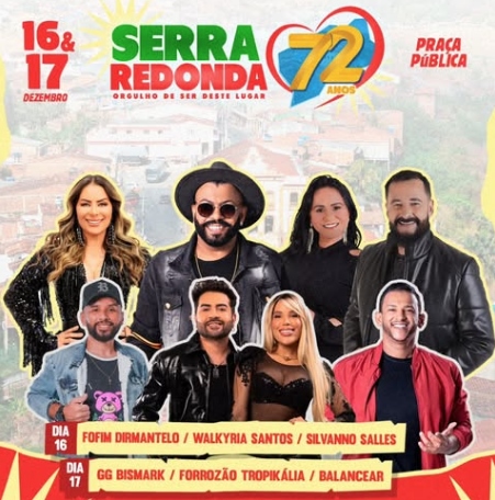 Serra Redonda continua nesta segunda-feira, dia 16, as comemorações pelos 72 anos de emancipação política com uma programação especial de shows em Praça Pública do município.