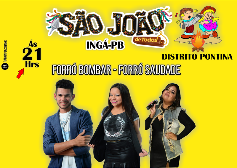 Abrindo a programação de São João 2018 em Ingá, na noite deste sábado (09 ) tem forró no Distrito de Pontina em praça pública com as bandas Forró Bombar e Forró Saudade.