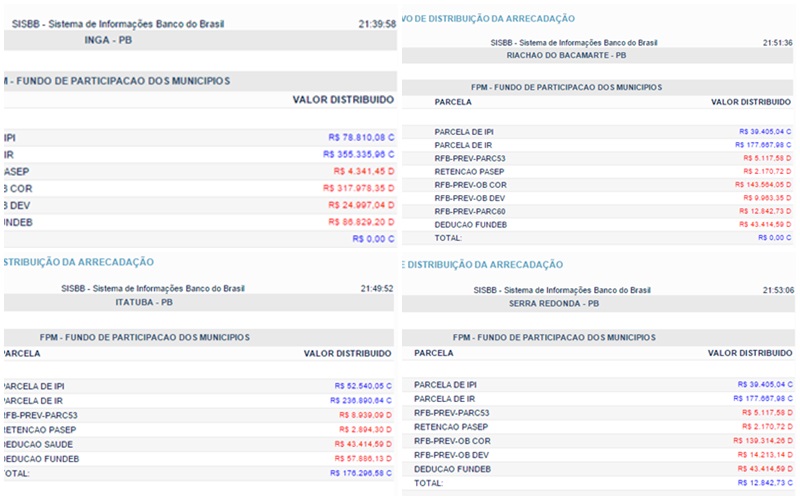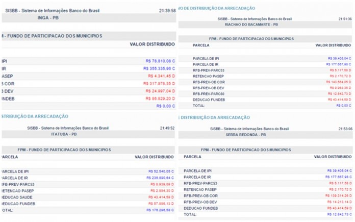 Segundo os dados disponíveis no Sistema de Informações do Banco do Brasil, por meio do Demostrativo de Distribuição da Arrecadação, que mostram os valores dos repasses do FPM e também as deduções com as obrigações, os saldos das prefeituras de Ingá e Riachão do Bacamarte ficaram zerados nesta primeira parcela do mês de março, devido aos bloqueios automáticos do valores destinados ao recolhimento do INSS, o que aumenta ainda mais a situação de aperto geral das prefeituras.