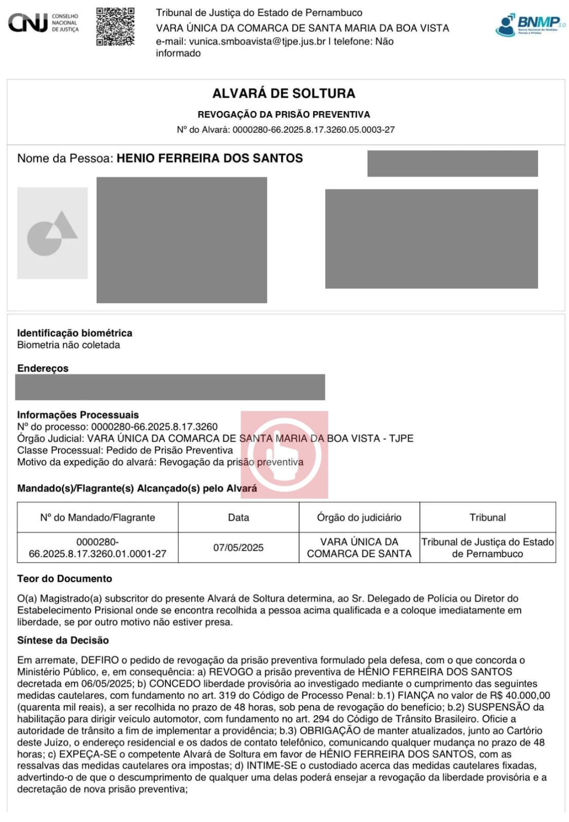 A decisão foi emitida ontem (2) a noite e por ser necessária uma tramitação entre a justiça de Pernambuco para informar a justiça da Paraíba, a soltura do artista deverá ocorrer por volta das 8h desta terça-feira (3).