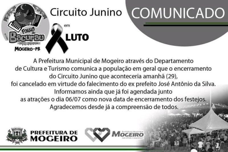 A Prefeitura Municipal de Mogeiro emitiu comunicado cancelando os festejos juninos e marcando uma nova data pra o Circuito Junino. Dia 06 de Julho.