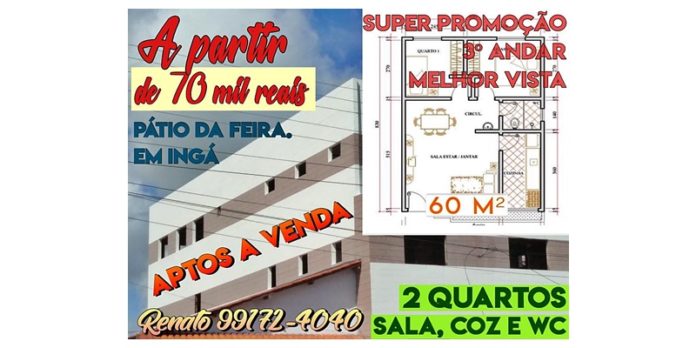 Apartamentos novos para vender com aproximadamente 60 m², bem localizados, de frente para a feira do Mercado Público de Ingá, com a melhor vista da cidade e preço a partir de R$ 70.000,00 (setenta mil reais).