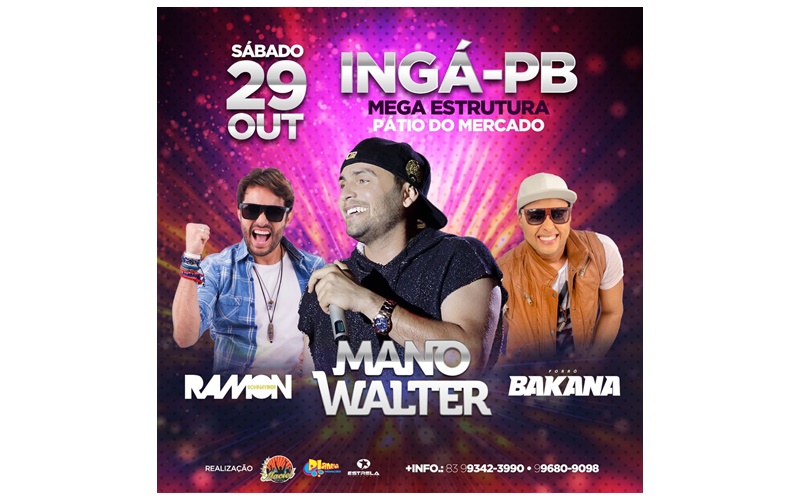 O grande público de Ingá e região será recebido com uma mega estrutura no Clube Industrial para a festa vip digna dos grandes eventos indoor da Paraíba, que terá como atrações: Mano Walter, Ramom Schnayder e Forró Bakana.