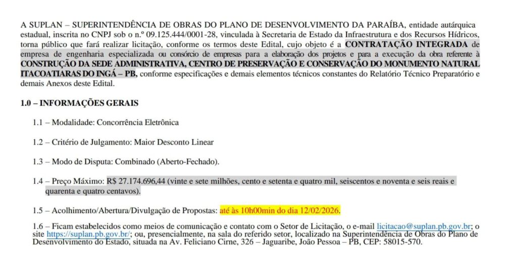 O Governo da Paraíba publicou uma licitação no valor de R$ 27 milhões para contratação de uma empresa responsável por elaborar os projetos e executar a construção da nova sede administrativa e do centro de preservação do Monumento Natural Itacoatiaras do Ingá. O edital prevê que a mesma empresa desenvolva todas as etapas, desde os estudos técnicos até a entrega da obra.