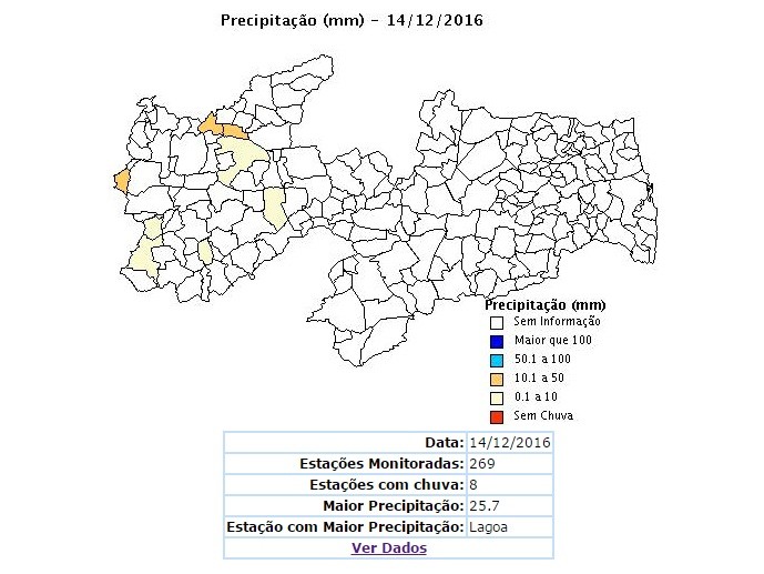 No acumulado do mês de dezembro, o órgão registrou chuvas em 15 cidades de todo o estado, sendo que em dezembro de 2015 choveu em mais de 100 cidades. Dos 126 açudes monitorados pela Aesa, 69 deles estão em situação considerada crítica, com menos de 5% de sua capacidade.