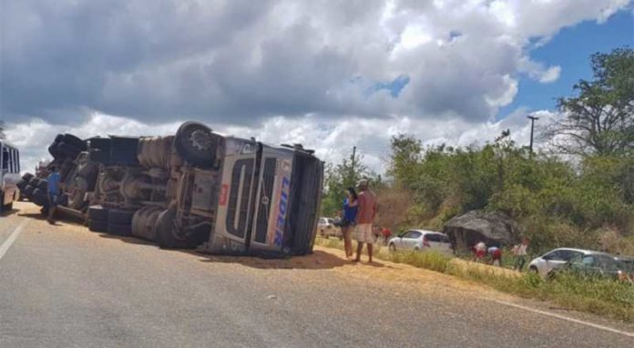 Carreta carregada com milho tomba na BR-230, próximo a CG