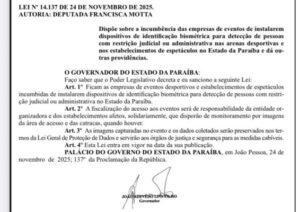O governador João Azevêdo sancionou a Lei 14.137 de autoria da deputada Francisca Motta, que obriga as empresas de evento a instalar dispositivos de identificação biométrica para detecção de pessoas com restrição judicial ou administrativa em arenas desportivas como estádios e nos estabelecimentos de espetáculos da Paraíba.
