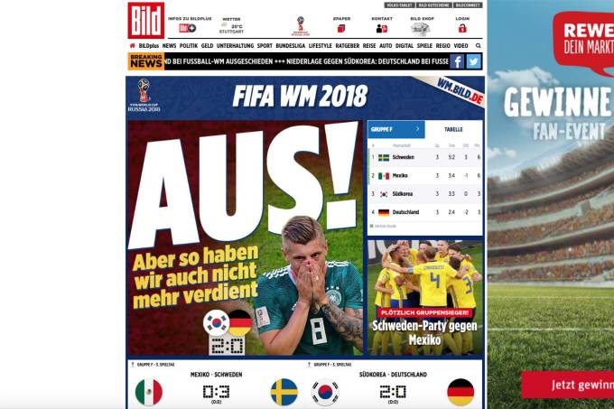 A rede de televisão internacional da Alemanha, a Deutsche Welle (DW), trazia on-line a manchete “Alemanha é expulsa da Copa do Mundo”. A rede lembra que esta é a primeira vez na história que a Alemanha é eliminada na primeira fase do torneio.
