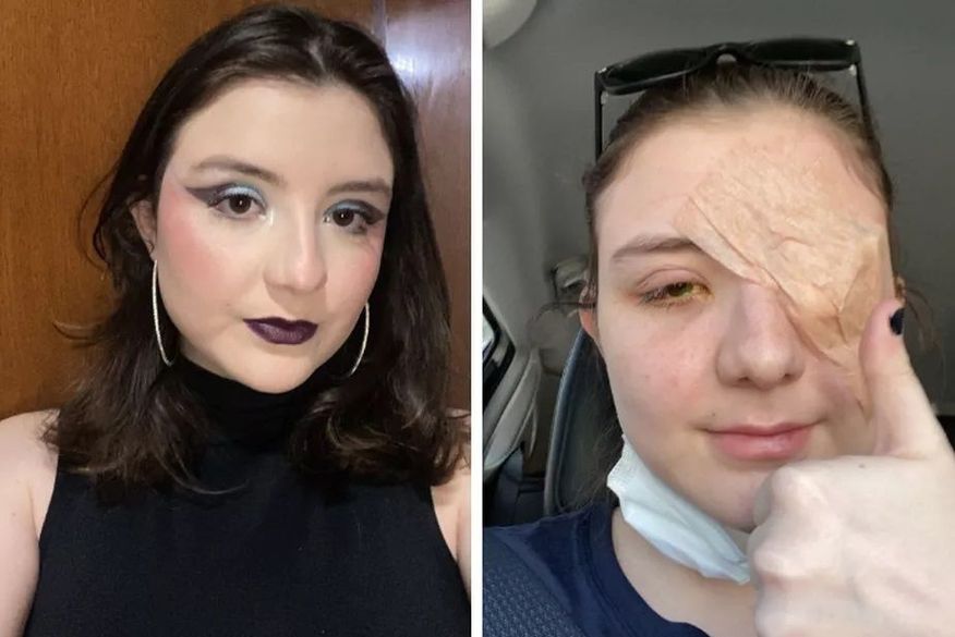 Como a dor e a ardência continuaram, o namorado a levou a uma farmácia, onde lavou os olhos com soro fisiológico.