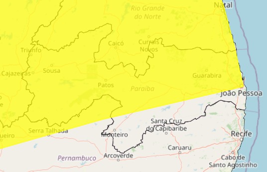 Conforme observou o ClickPB, as cidades sob alerta podem registrar chuvas de até 50 mm/dia e ventos de até 60 km/h.