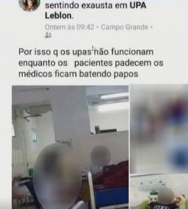 “Por isso que as UPAs [Unidades de Pronto Atendimento] não funcionam. Enquanto os pacientes padecem, os médicos ficam batendo papo”. A mensagem postada no Facebook em 6 de novembro de 2018 mostra a foto de um paciente acamado e dois médicos conversando na Unidade de Pronto Atendimento do Jardim Leblon em Campo Grande (MS). A autora da postagem chegou a marcar a página da Unidade de Saúde na publicação.