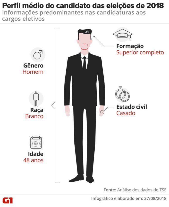 Homem, branco, casado, com 48 anos e ensino superior completo. Esse é o perfil médio dos candidatos que disputam as eleições neste ano. E essas características mudam pouco de acordo com o cargo eletivo. Para a análise, o G1 usou os dados das candidaturas divulgados pelo Tribunal Superior Eleitoral (TSE). São, no total, mais de 28 mil candidatos nas eleições de 2018.