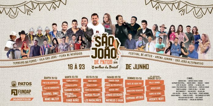 A programação do São João de Patos 2019 irá contemplar, além de shows, uma vasta programação cultural com a Vila São João; Arena Junina; Arrastão da Drilha; Festival de Quadrilhas; Arena das Quadrilhas; Passeio das Carroças; Corrida da Fogueira; Festival de Artes; Casamento Coletivo; Feira de Negócios; Concursos, São João Alternativos, Sol João na Praça e outras ações.
