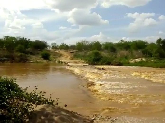 Vídeos gravados por moradores da região mostram a água descendo rio a baixo, no município de Caraúbas, seguindo rumo ao açude Epitácio Pessoa, em Boqueirão.