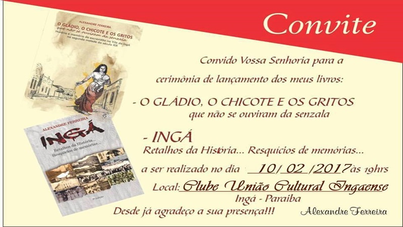 O historiador, pesquisador e professor Alexandre Ferreira convida autoridades e leitores em geral para cerimônia de seu novo livro – O GLÁDIO, O CHICOTE E OS GRITOS que não se ouviram da senzala,  e a segunda edição de seu primeiro livro RETALHOS DA HISTÓRIA…RESQUÍCIOS DE MEMÓRIAS. Ambos abordam aspectos históricos do município, com enfoque especial sobre detalhes pitorescos do período pós escravidão que não são tratados nos tradicionais livros históricos tradicionais escritos pela com base na classe dominadora.