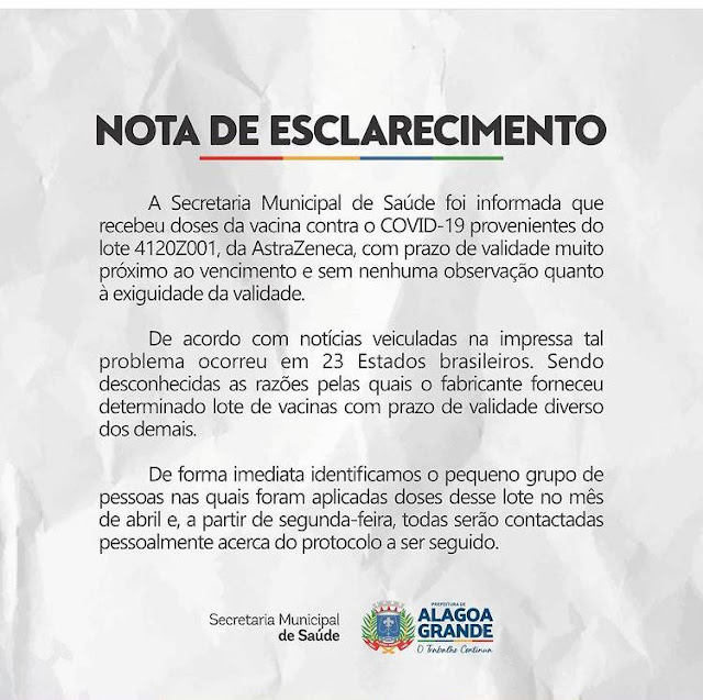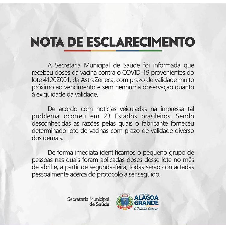 A Secretaria de Saúde de Alagoa Grande emitiu uma NOTA DE ESCLARECIMENTO sobre a aplicação de doses vencidas da AstraZeneca no Município. Veja Nota abaixo;