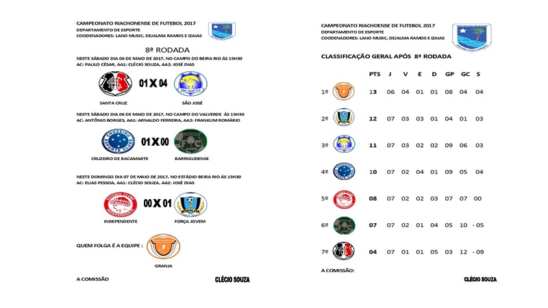 Depois da realização dos jogos da 8ª Rodada do Campeonato Riachonense 2017 a briga pela liderança fica cada vez mais equilibrada e emocionante. Apenas 3 pontos distanciam o 1º colocado, Granja, para o 4º colocado, o Cruzeiro. A 9ª rodada será decisiva na briga pela ponta da tabela.