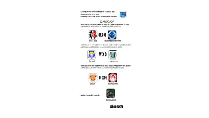 Três jogos pela 12ª rodada do Campeonato Municipal de Riachão 2017, onde foi registrado um empate e duas vitórias, sendo uma por WO.