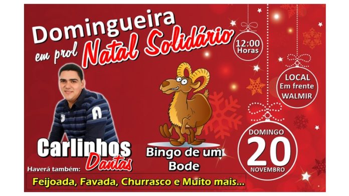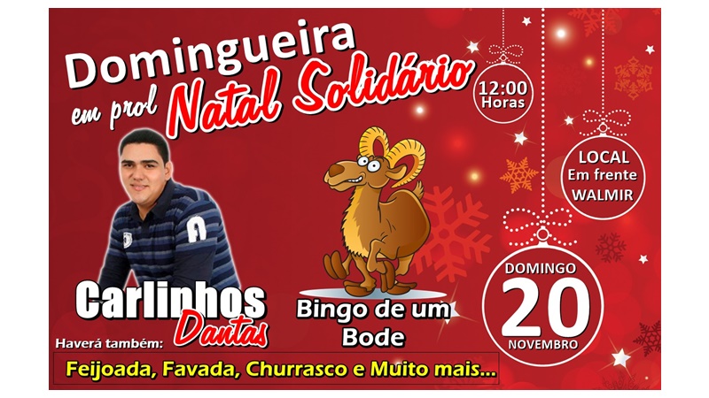 Pois então, neste domingo dia 20 venha participar de uma animada domingueira em Juarez Távora, em frente a Walmir, onde vai rolar muita música da boa ao vivo com Carlinhos Dantas, além de feijoada, favada, churrasco e um bingo de um bode em benefício ao 5º NATAL SOLIDÁRIO.