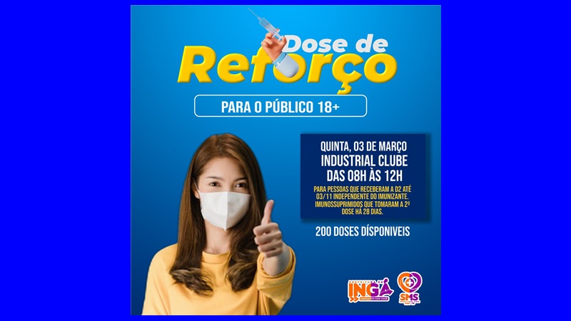 A Secretaria Municipal de Saúde comunica a todo público geral 18+ que recebeu a D2 (segunda dose) independente do imunizante, até 03/11/2021 e aos imunossuprimidos que tomaram a segunda dose à 28 dias que na próxima quinta-feira (03/03) estará sendo realizada a Dose de Reforço.