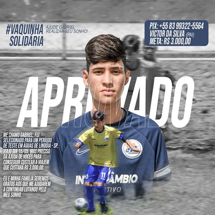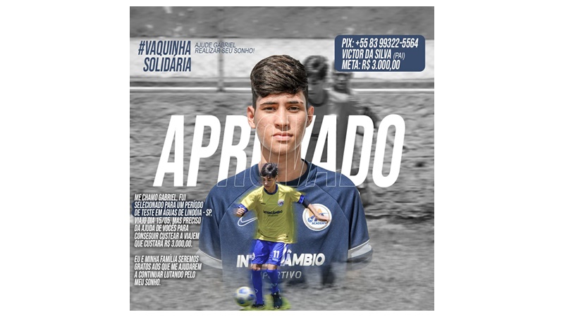 Gabriel, 17 anos, meia atacante,  precisa viajar para a cidade de Águas de Lindóia no Estado de São Paulo, no  dia 15 de maio, tendo como custos de viagem em torno de R$ 3.000,00 (três mil reais) e necessita de ajuda financeira para conseguir seu objetivo.