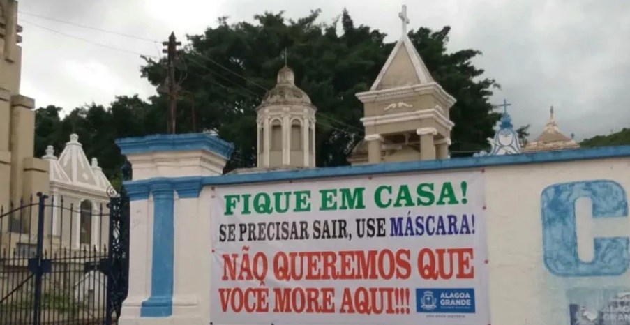 A prefeitura de Alagoa Grande, na Paraíba, espalhou faixas pela cidade para consciencializar a população sobre a pandemia de Covid-19. A ação foi feita em locais públicos, entre eles, o cemitério da cidade. “Não queremos que você more aqui”, diz a faixa colocada na frente do cemitério São Sebastião.