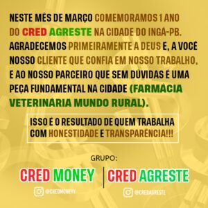 O Grupo Cred Money/Cred Agreste tem a honra neste mês de está comemorando 1 ano na cidade de Ingá -PB com ponto fixo e com apoio da Farmácia Veterinária Mundo Rural, só temos a agradecer a nossos clientes pela confiança depositada em nosso trabalho aos nossos indicadores e parceiros, 2022 está apenas começando e muitas novidades estão por vir em investimentos e prosperidade para com essa cidade que nos acolheu de braços abertos.