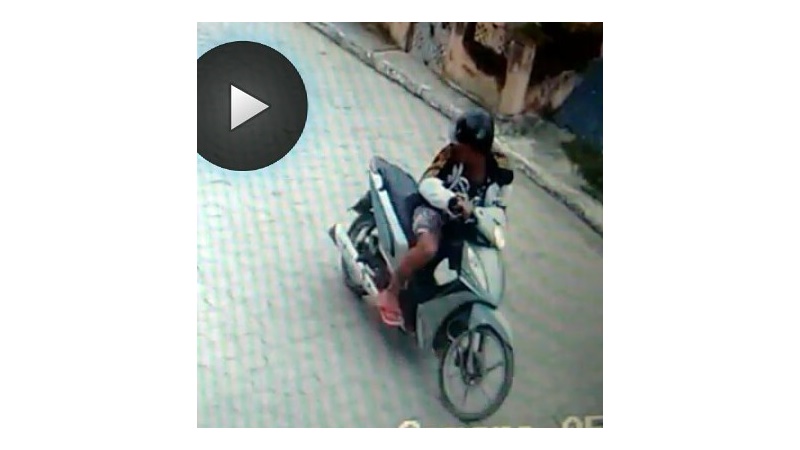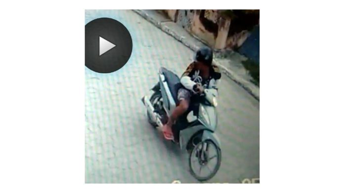 Câmera de segurança localizada em rua próxima onde ocorreu o furto flagrou um rapaz pilotando a moto e olhando para trás, demonstrando desconfiança, agindo sorrateiramente.