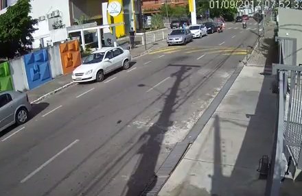 No vídeo é possível ver que, ao ser abordada, a mãe abraça a filha e entrega o relógio a um dos assaltantes, enquanto o outro espera em uma motocicleta preta ao lado do carro. O segurança Fábio Alves de Lima, de 38 anos, percebe o assalto e sai correndo de dentro da escola. Fábio agarra o assaltante que abordou a mãe e os dois saem da imagem captada pela câmera.