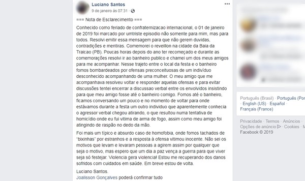 De acordo com o relato da vítima, confirmado pela Polícia Civil, ele estava em uma festa de réveillon, na praia de Baía da Traição, quando resolveu ir até o banheiro e chamou um amigo para acompanhá-lo. No trajeto entre a festa e o banheiro, Luciano contou que foi vítima de “ofensas preconceituosas de um indivíduo desconhecido acompanhado de uma mulher”.