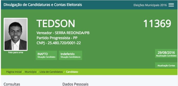 O candidato a vereador de Serra Redonda pelo PP, Tedson Firmino da Silva, pertencente a coligação UNIDOS POR UM FUTURO MELHOR, teve seu registro de candidatura indeferido pela juíza eleitoral, Dra. Andrea Caminha da Silva, por não  possuir domicílio eleitoral na circunscrição pelo prazo de, pelo menos, 1 (um) ano.