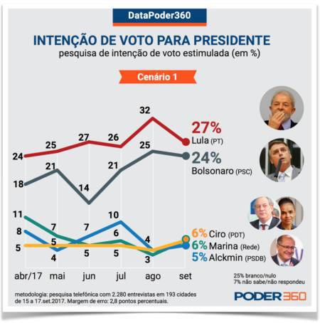 Pesquisa DataPoder360 de setembro revela que houve algum impacto negativo para o pré-candidato do PT a presidente Luiz Inácio Lula da Silva o noticiário dos últimos dias e semanas sobre a Lava Jato. O petista registrava em agosto 31% e 32% de intenção de votos. Agora, tem 27% a 28%, dependendo do cenário testado.
